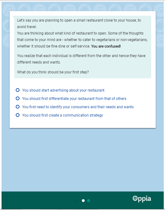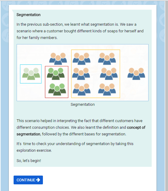 - Interactive elements: Some of our courses contain interactive elements such as exploration exercises (from Oppia) and interactive visual display boards. Explorations are interactive elements that help learners to learn concepts in a fun and a creative way using images, text and questions. It can act as a wonderful tool for self-learning. You can find these exploration exercises in our course on Marketing Management.